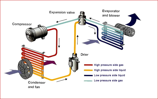 Sistem penghawa dingin kereta adalah kitaran tertutup yang menggunakan gas penyejuk untuk menyejukkan kabin.